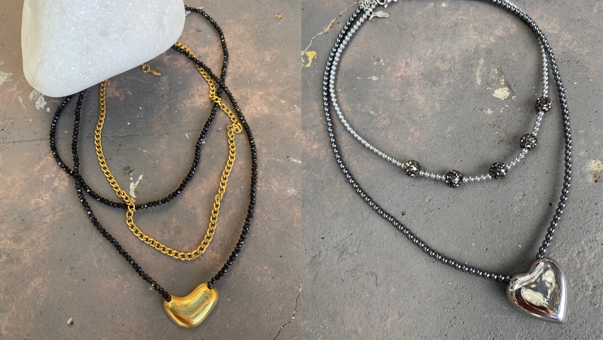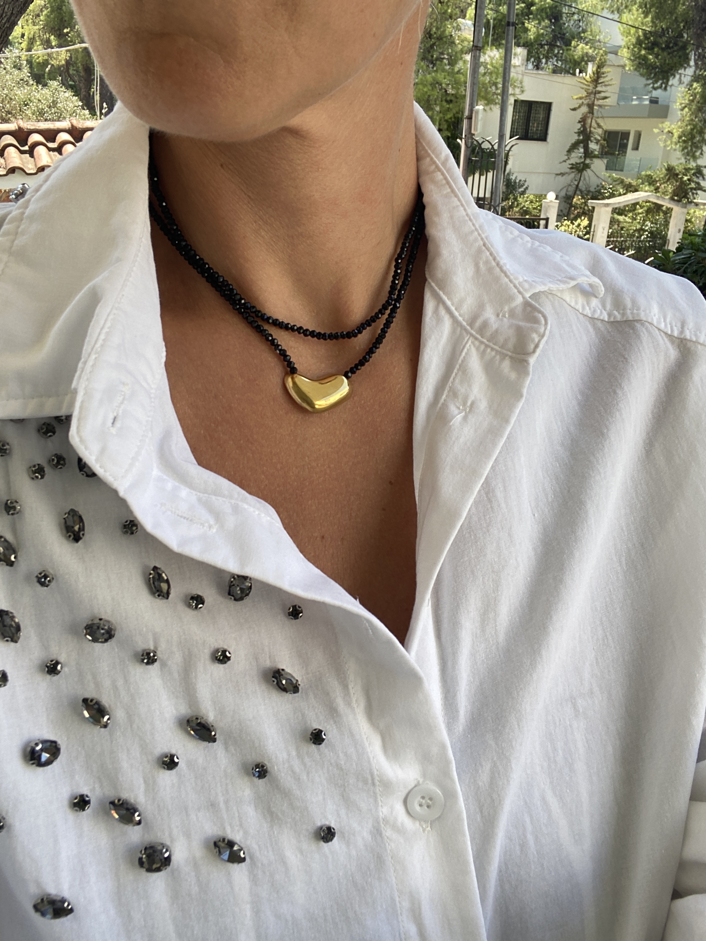 Αυτό το κολιέ είναι η απόλυτη έκφραση της εσωτερικής σου δύναμης. Τα μαύρα κρυσταλλάκια σε τυλίγουν σε έναν μανδύα μυστηρίου , ενώ η χρυσή καρδιά φωτί..