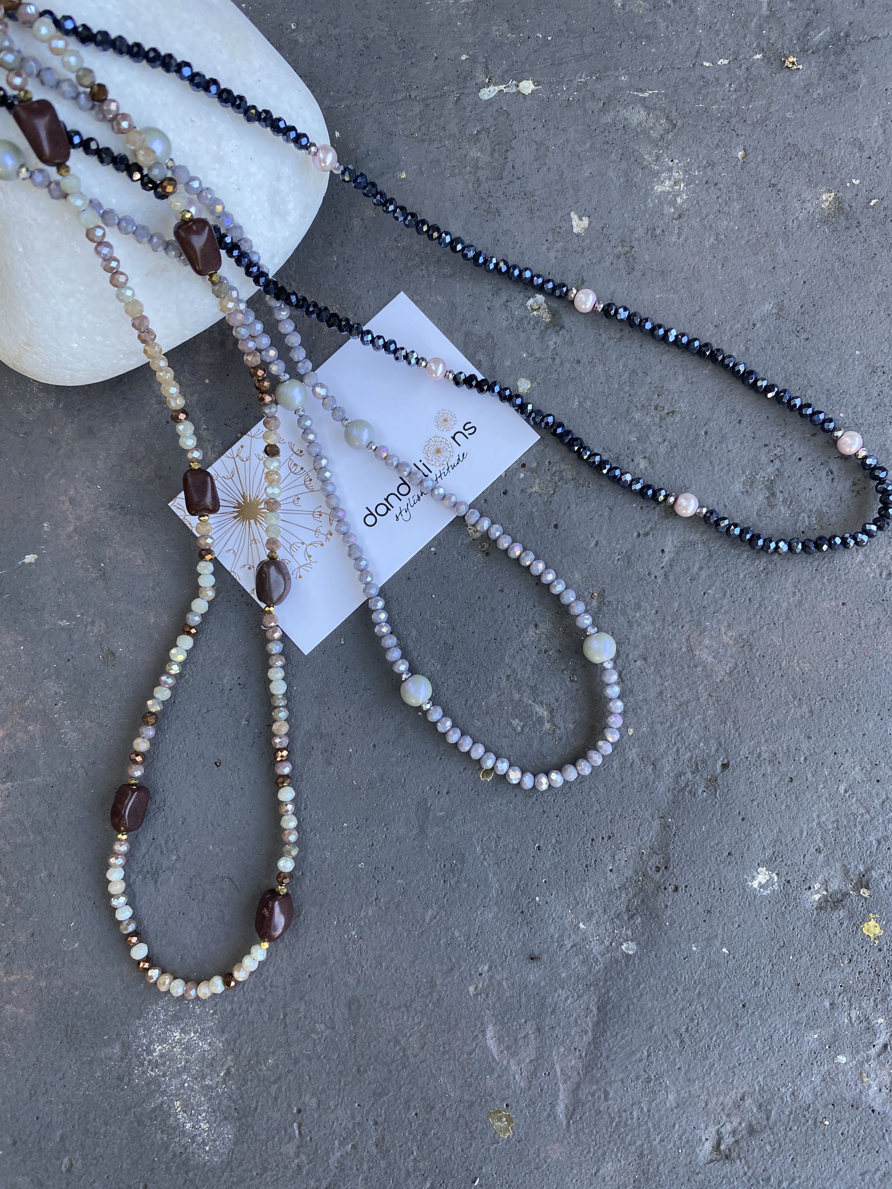 Ένα διπλό κολιέ που δίνει απάντηση στην ευελιξία που χρειάζεσαι στο styling. Σοκολατί και μπεζ κρύσταλλα που εναλλάσσονται με καφέ χαολίτες, δημιουργώ..